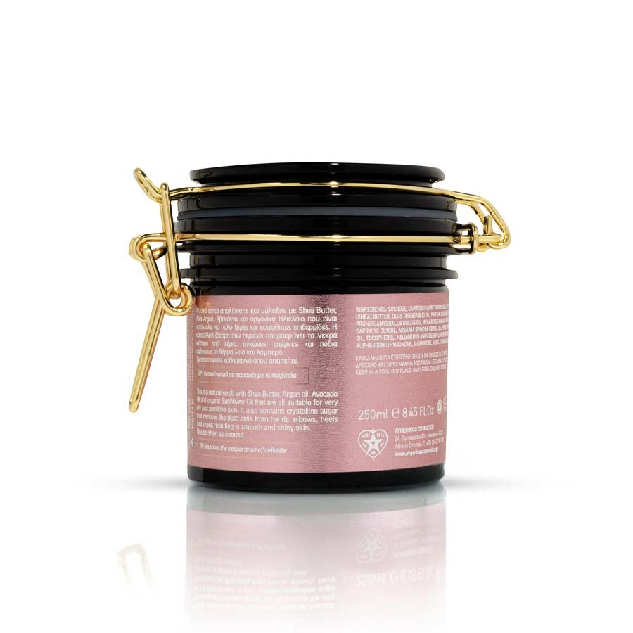Απολέπιση Σώματος & Χεριών – Αναζωογόνηση- Λείανση 97% συστατικά φυσικής προέλευσης Προϊόν απολέπισης με κόκκους ζάχαρης, έλαια φυσικής προέλευσης, αντιοξειδωτικούς παράγοντες. Απομακρύνει τα νεκρά κύτταρα από την επιφάνεια και επαναφέρει άμεσα λεία και απαλή υφή στα σημεία του σώματος με έντονη ξηρότητα, στις φτέρνες, στους αγκώνες και στα γόνατα. Οι κυκλικές κινήσεις μασάζ την ώρα της εφαρμογής βελτιώνουν την κυκλοφορία και έχουν αποσυμφορητική δράση με αποτέλεσμα την αισθητή λείανση της κυτταρίτιδας και της όψης φλοιού του πορτοκαλιού. •Το βούτυρο καριτέ ( shea butter) με υψηλή περιεκτικότητα σε φυτικά λιπαρά οξέα, φαινολικές ουσίες και βιταμίνες Α και Ε αποτρέπει τη διαδερμική απώλεια νερού, παρέχει πλούσια θρέψη και προστασία από τις ελεύθερες ρίζες. •Το έλαιο αβοκάντο περιέχει μονοακόρεστα και πολυακόρεστα λιπαρά οξέα, βιταμίνη Α, Ε, κάλιο, φολικό οξύ και αμινοξέα που το κάνουν να ξεχωρίζει για την πλούσια ενυδατική, θρεπτική, αντιοξειδωτική και αναπλαστική του δράση. •Το έλαιο argan ξεχωρίζει για την υψηλή περιεκτικότητά του – 80%- σε ακόρεστα λιπαρά οξέα, ω6 λινολεϊκό οξύ, ω3 α-λινολεϊκό οξύ, τοκοφερόλες και στερόλες καταπολεμά την έντονη ξηρότητα, προστατεύει και επανορθώνει το υδρολιπιδικό φιλμ στην επιφάνεια του δέρματος, τονώνει την οξυγόνωση των κυττάρων, εξουδετερώνει τις ελεύθερες ρίζες και παρέχει πλούσια θρέψη. •Οι κρυσταλλικοί κόκκοι ζάχαρης απολεπίζουν σε βάθος την επιδερμίδα απομακρύνοντας άμεσα τα νεκρά κύτταρα από την επιφάνεια. •Τα ειδικά επιλεγμένα έλαια φυσικής προέλευσης σχηματίζουν ένα λεπτό, προστατευτικό φιλμ στην επιφάνεια που αποτρέπει την εξάτμιση νερού από τις κατώτερες στιβάδες. •Οι αντιοξειδωτικοί παράγοντες με υψηλή περιεκτικότητα σε τοκοφερόλες (βιταμίνη Ε) από έλαιο ηλίανθου οργανικής καλλιέργειας προστατεύουν από το οξειδωτικό στρες και την πρόωρη φθορά του δέρματος. Ενισχυμένο με το Baby Talc, ένα απαλό άρωμα πούδρας με νότες απο Κρίνο και Ylang Ylang. Σύνθεση δερματολογικά ελεγμένη, vegan, χωρίς γλουτένη και parabens.