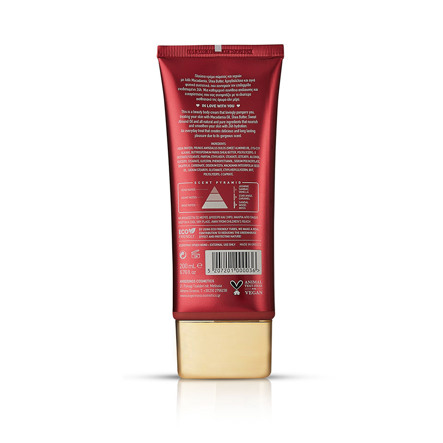 Ενυδατική κρέμα σώματος 95,8% συστατικά φυσικής προέλευσης Πλούσια κρέμα για το σώμα με έλαια macadamia ,αμυγδάλου και βούτυρο karité (shea butter) για πλούσια ενυδατική δράση που αποτρέπει την απώλεια υγρασίας χωρίς να λιπαίνει την επιδερμίδα και απορροφάται άμεσα. Ενισχυμένη με το Hammam, ένα ανατολίτικο, μυστηριώδες άρωμα. •Το έλαιο macadamia με υψηλή περιεκτικότητα σε βιταμίνες Α, Β1, Β2, Β3 , C και Ε, πρωτεΐνες, πολύτιμα μέταλλα- μαγνήσιο και σίδηρο- , λιπαρά οξέα και πλούσιο σε παλμιτελαϊκό οξύ Ω-7 προσφέρει ενισχυμένη αντιοξειδωτική δράση και ενυδατική δράση. •Το βούτυρο καριτέ ( shea butter) με υψηλή περιεκτικότητα σε φυτικά λιπαρά οξέα, φαινολικές ουσίες και βιταμίνες Α και Ε αποτρέπει τη διαδερμική απώλεια νερού, παρέχει πλούσια θρέψη και προστασία από τις ελεύθερες ρίζες. •Το έλαιο αμυγδάλου είναι πλούσιο σε ολεϊκό και παλμιτικό οξύ, πρωτεΐνες, βιταμίνες Α, Β1, Β2, Β6, D και Ε, μονοακόρεστα λιπαρά οξέα και ιχνοστοιχεία που το κάνουν να ξεχωρίζει για τις καταπραϋντικές, αντιφλεγμονώδεις ιδιότητες. Συμβάλλει στην αποκατάσταση της ξηρής επιδερμίδας και βελτιώνει άμεσα τα επίπεδα ενυδάτωσης. Σύνθεση δερματολογικά ελεγμένη vegan, cruelty free, χωρίς γλουτένη και parabens. Κυκλοφορεί σε συσκευασία 200ml. ΑΡΩΜΑΤΙΚΗ ΠΥΡΑΜΙΔΑ Νότες Κορυφής: Γιασεμί Σαμπάκ, Βανίλια Νότες “Καρδιάς”: Γλυκάνισος, Καραμέλα Νότες Βάσης: Σανταλόξυλο, Βρύα Βελανιδιάς
