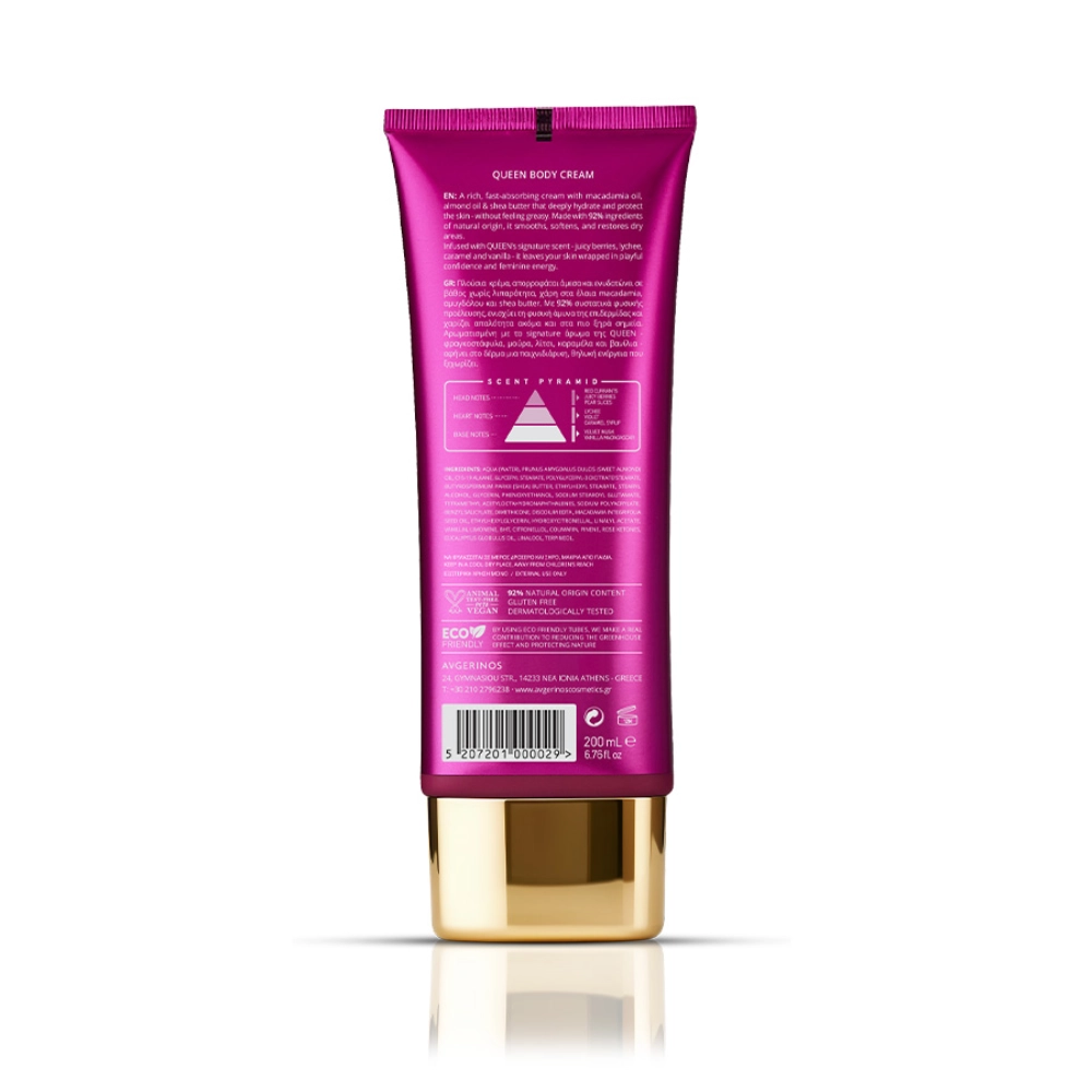 Απολαύστε μια πλούσια αλλά ελαφριά κρέμα σώματος, χωρίς λιπαρότητα, που απορροφάται άμεσα, αφήνοντας την επιδερμίδα ενυδατωμένη, απαλή και αρωματισμένη με το signature άρωμα QUEEN. Η σύνθεση συνδυάζει μαλακτικά και ενυδατικά έλαια, για μια καθημερινή τελετουργία που τονίζει τη θηλυκότητα και τη λάμψη σας. Η επιδερμίδα μένει απαλή, ελαστική και διακριτικά αρωματισμένη όλη μέρα.